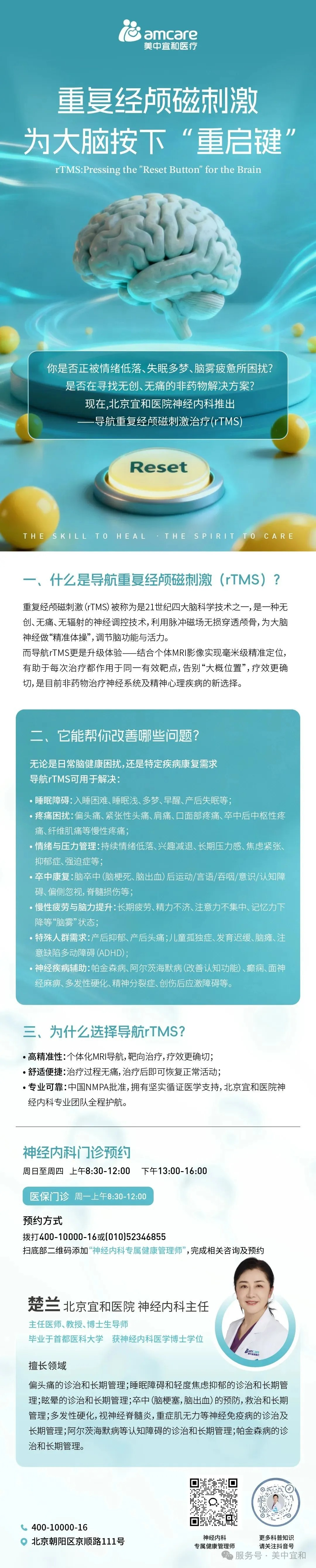 兩難之(zhi)下小(xiǎo)羽來到(dao)宜咊(he)醫(yī)院就診,在(zai)神經(jing)內(nei)科(ke)楚主(zhu)任的(de)詳細評估後(hou),針對她入睡困難、睡眠淺、易醒等(deng)睡眠障礙問題,以(yi)及(ji)比較抗拒服藥的(de)訴求,建(jian)議她可(kě)以(yi)嘗試一(yi)種非(fei)藥物(wù)、無創的(de)物(wù)理(li)治療——重(zhong)複經(jing)顱磁刺激。